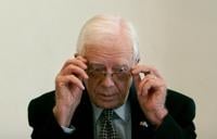 Former U.S. President Jimmy Carter pauses during an interview as he and his wife Rosalynn visit a Habitat for Humanity project in Leogane, Haiti, Monday Nov. 7, 2011. The Carters joined volunteers from around the world to build 100 homes in partnership with earthquake-affected families in Haiti during a week-long Habitat for Humanity housing project. (AP Photo/Ramon Espinosa)