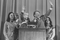 Democratic gubernatorial nominee Jimmy Carter and his wife Rosalynn clutch the microphones as he claims victory in a runoff election at campaign headquarters in Atlanta, Georgia, September 24, 1970. Carter beat former Georgia Governor Carl Sanders for the nomination and will face Republican candidate Hal Suit, veteran television newsman, in the general election Nov. 3, 1970. (AP Photo/Charles Kelly)