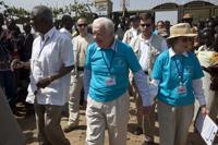 Former U.S. President Jimmy Carter, his wife, Rosalynn, and former UN Secretary General Kofi Annan conclude a visit to a polling center the southern capital of Juba Sunday, Jan. 9, 2011. (AP Photo/Pete Muller)