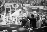Jimmy Carter, Democratic candidate for president, is joined by his daughter, Amy, as he waves from the rostrum at Fort Worth Convention Center, Texas, Sunday, Nov. 1, 1976. Carter and his family have been campaigning Texas, making a last minute bid for the state’s 26 electoral votes. The others are not identified. (AP Photo)