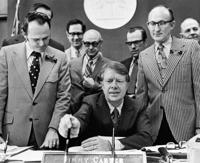 Georgia’s Gov. Jimmy Carter reaches for pen February 25, 1972 to sign a Georgia Senate House resolution opposing forced busing to achieve integration in the classrooms of the United States.