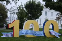 A sign wishing former President Jimmy Carter a happy 100th birthday sits on the North Lawn of the White House in Washington, Tuesday, Oct. 1, 2024. (AP Photo/Susan Walsh)