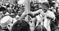 Former Georgia Gov. Jimmy Carter, right, drew about 5,000 people to Youngstown’s Federal Plaza in Youngstown, Ohio, in his quest for support in Tuesday’s Ohio Democratic primary, June 7, 1976. The presidential hopeful waded into the crowd, shaking hands and signing autographs. Carter, speaking to the largest crowd to assemble during his Ohio campaign, said 1976 would be a Democratic year because of the Watergate aftermath and other national ills. (AP Photo)