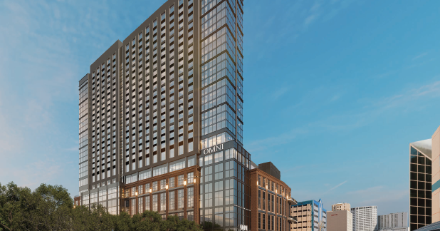 Una representación del nuevo diseño del Omni Hotel en Convention Center Boulevard. Si todo va según lo previsto, será el hotel más grande construido en Nueva Orleans desde los años 1970. El nuevo diseño incluirá una torre principal en el borde del distrito de almacenes que tendrá 316 pies de altura, o aproximadamente 29 pisos.