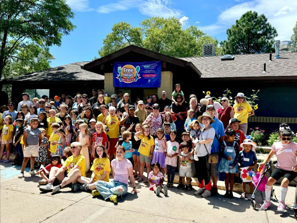 Foto de cortesía: Los niños y voluntarios de Tynkertopia se reúnen para buscar fotos grupales.