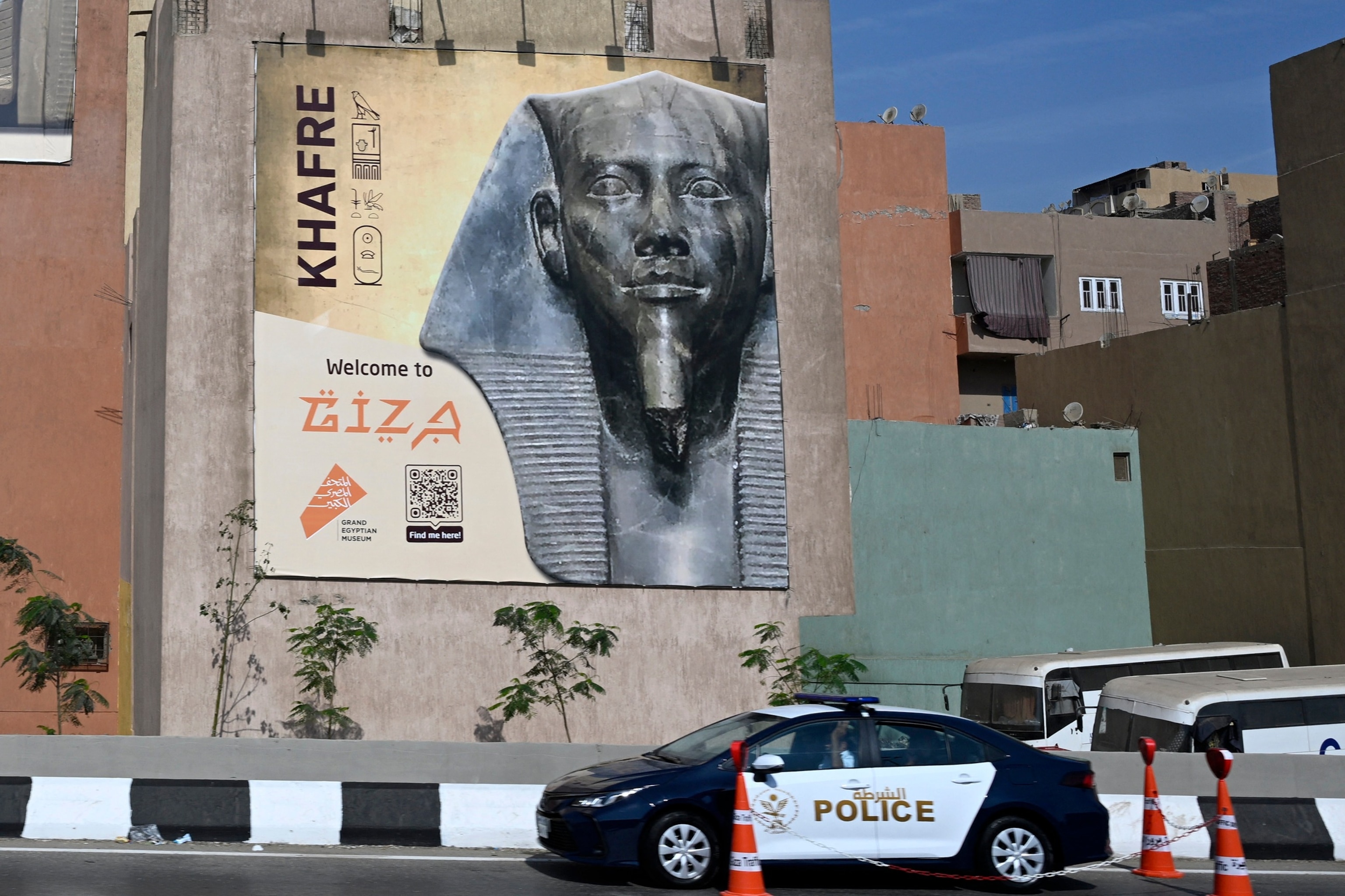 Los vehículos policiales están estacionados a lo largo de la carretera de circunvalación cerca de una pancarta que anuncia la inauguración del Gran Museo Egipcio el 1 de noviembre de 2025 en El Cairo, Egipto.