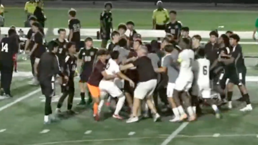 Una violenta pelea entre equipos de fútbol de secundaria se extiende fuera del campo y en las calles que rodean el estadio.