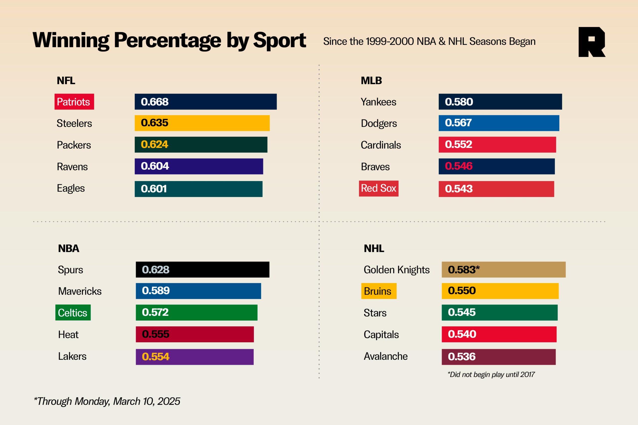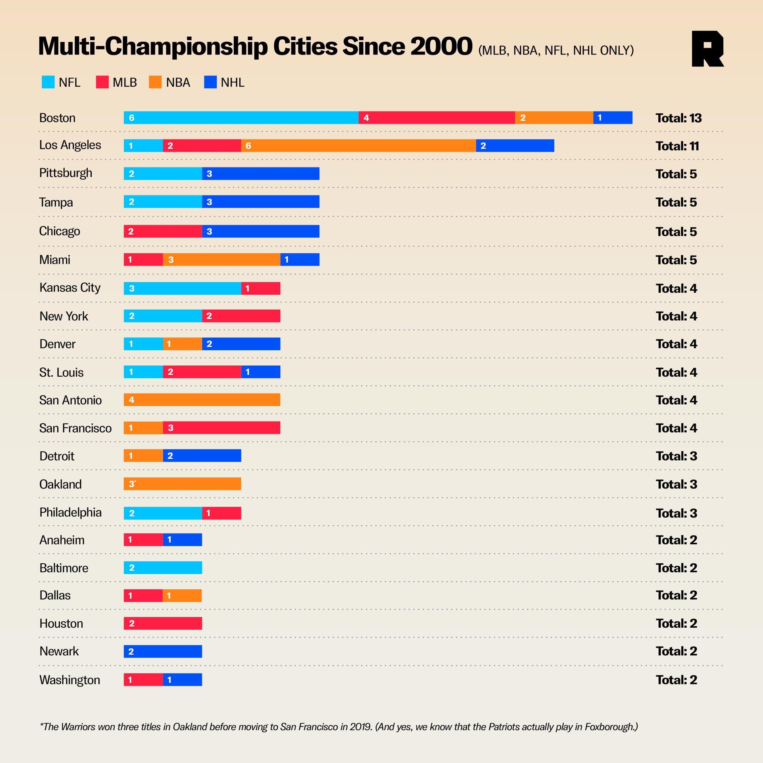 And you would’ve been dramatically wrong. The Patriots won two of the next three championships, joining a very short list of teams that have won a trio of titles in a four-year stretch. Then the region’s other franchises got on the duck boat. All told, the city has won 13 championships in the major men’s pro sports since the dawn of the century, more than any other city in that timeframe (provided you don’t add the two Anaheim titles to L.A.’s 11, something no reasonable Angeleno would ever dream of). But beyond simple counting stats, Boston’s titles have felt more seismic. Maybe it’s the passion—or arrogance—of the fan base. Maybe it’s the towering figures that four major franchises have produced, both on the field and in the press box. Or maybe it’s simply the fact that whether you love them or hate them, these teams are responsible for many of the best on-field moments of recent years, win or lose. (For example, nine of The Ringer’s top 100—and five of our top 20—involve Boston in some way.) For better or worse, this has been the Boston sports century. “We’re looking at 13 parades since February ’02, and there’s a stretch of six years and four months when they all won—all four,” Shaughnessy says. “That hasn’t happened anywhere.”