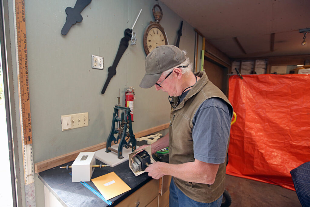 En su tienda cerca de Poulsbo, en el condado de Kitsap, Pease observó la procedencia local del reloj. en gran parte.